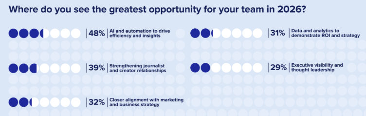 Nearly half of all PR professionals who participated in the Inside PR 2026 survey (48%) selected AI and automation as the No. 1 opportunity for teams in 2026. This outlook likely stems from the pressure to “do more with less” – which emerged as one of today’s top PR challenges – calling for comms teams to work more effectively amid fewer resources. After all, the report also found that 93% of PR teams are leveraging AI tools to enable faster execution, deeper insights, and more time for strategy and creativity.