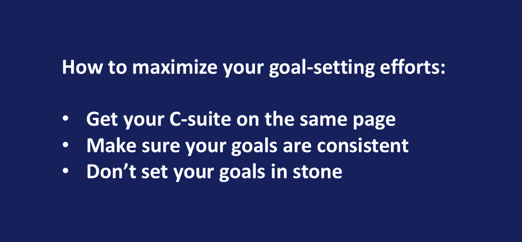 Get your C-Suite on the same page. Executive buy-in transforms communications goals from team resolutions into business priorities. With leadership support, you gain the resources and authority to achieve your goals. Moreover, having the C-suite on your side ensures your goals remain protected during budget discussions or strategic reorganization.