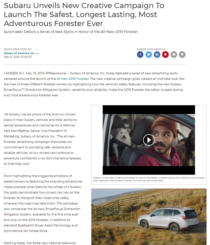 Subaru knows their target audience; it’s evident in their advertising and content marketing approach across all platforms, including this press release. Subaru customers are adventurous, but also family-oriented and concerned with safety. And generally, dog-lovers. So this release, about a campaign promoting their new Forester, appeals to exactly that target demographic. Subaru focuses their appeal with a variety of multimedia elements, including their logo, a short video and an engaging product shot. And in that imagery, the subset of readers most likely to buy a Forester can see a version of themselves. That personal appeal makes it more likely that a viewer will turn into a customer.