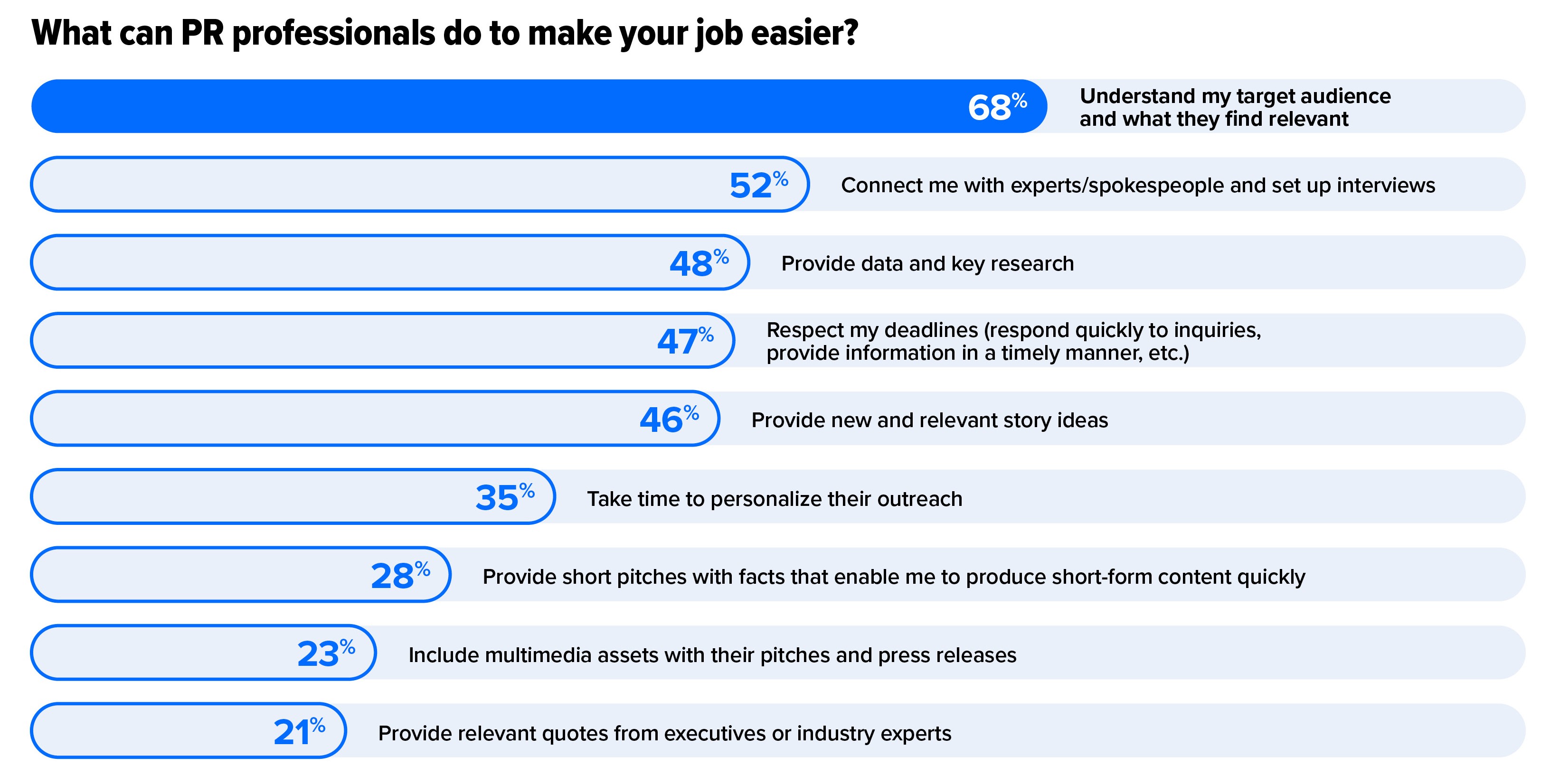 It’s no secret - one of the most powerful PR tactics when it comes to media outreach is personalization. Be sure you’re building time in your media outreach plan to customize your pitches. It shows you understand the journalist’s work, their outlet, and their audience. That is their number one request, as shown in their State of the Media survey responses below. When you demonstrate that you've done your homework, journalists take notice.