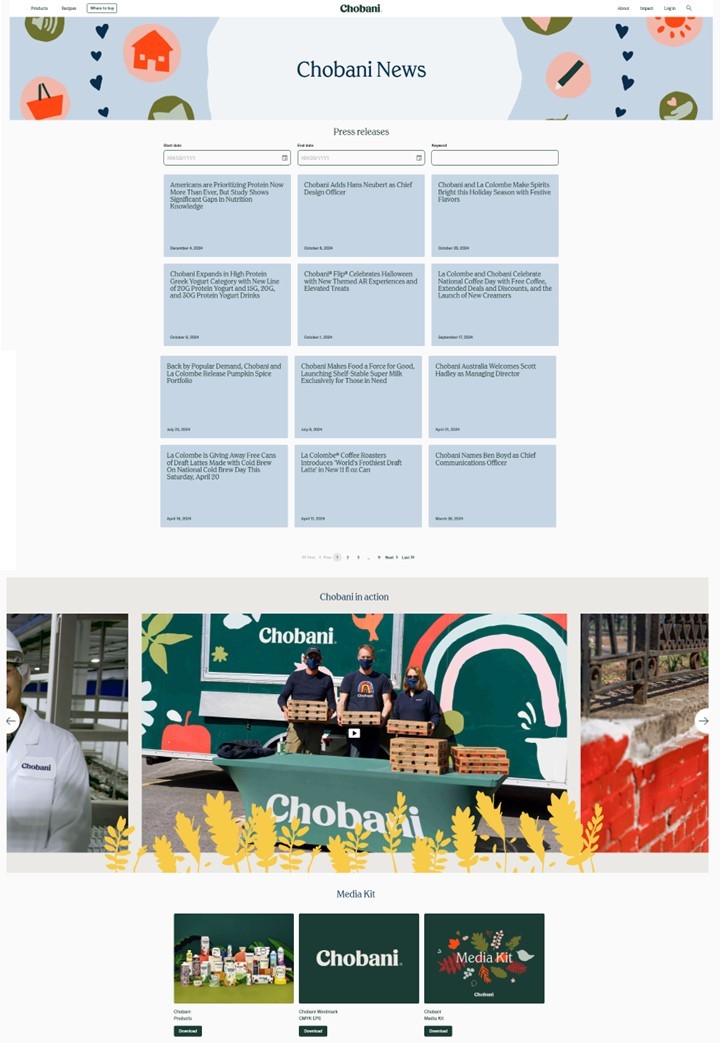 Chobani's newsroom perfectly aligns the content with their brand mission of making better food accessible to more people. The user-friendly layout prioritizes sustainability initiatives, community programs, and latest company news. Their comprehensive media kit shows their dedication to media accessibility, featuring high-resolution product photography and a well-designed brand story PDF that journalists can easily download and reference.