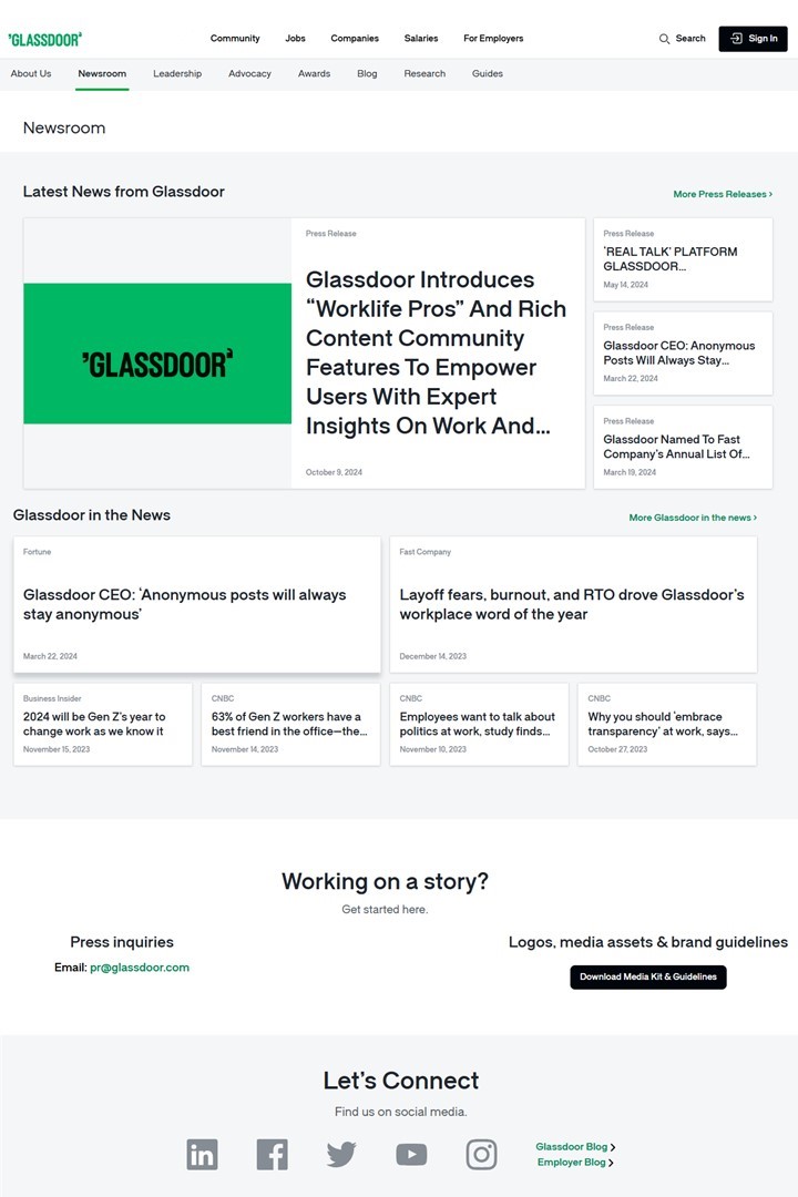 Glassdoor's newsroom emphasizes their authority on workplace trends and job market insights through strategically organized content. Their clean layout and intuitive navigation help different users quickly find relevant information. They excel at SEO-optimized content, with data-driven research reports and workplace insights that make it easy for media to source authoritative content on trending topics.