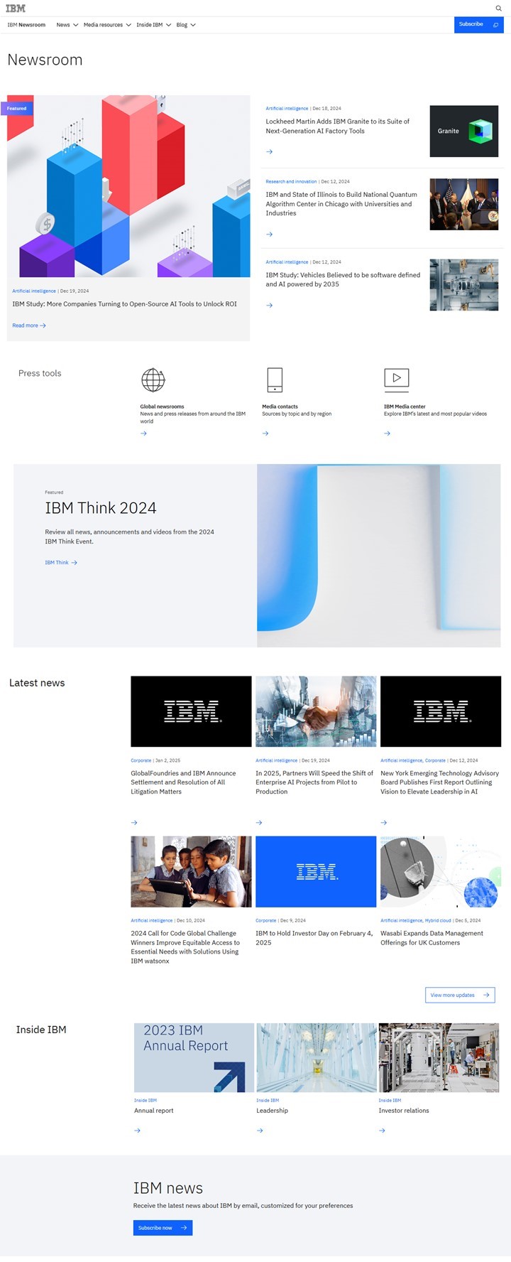 IBM demonstrates how to handle complex content for the ideal user experience. Their dropdown navigation breaks down their vast content library into digestible sections covering research, innovation, and corporate responsibility. They also help their media partners by providing topic and region-specific contacts alongside a robust multimedia library, with assets clearly organized and downloadable in various formats.