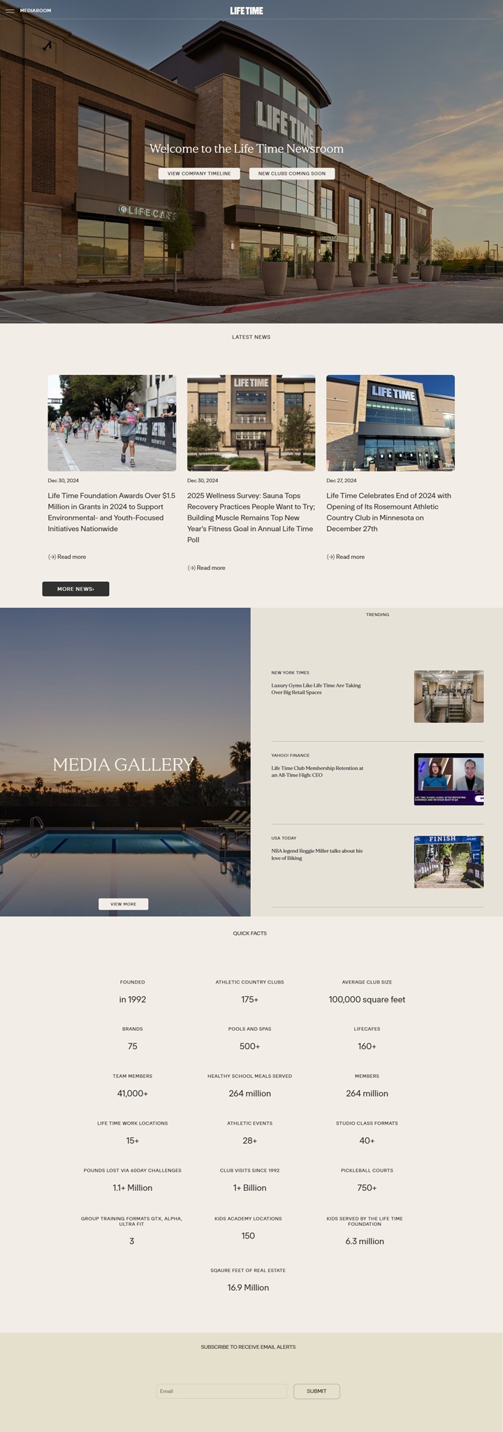 Life Time strategically tells the story of their current growth by placing expansion plans and the company’s timeline front and center. Their quick facts section makes key information instantly accessible. The clear sections for press releases, media coverage, and an extensive media library help journalists easily find and use their content for their stories.