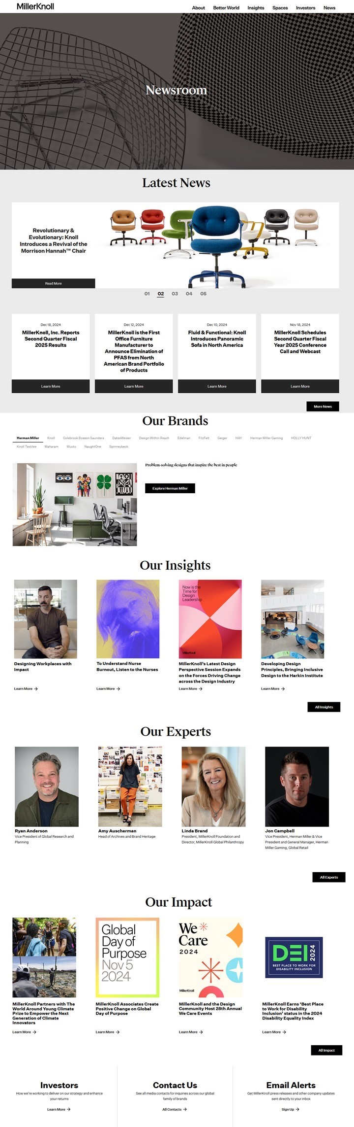 MillerKnoll's newsroom is a prime example of brand storytelling in action. They've created clear pathways to brand-specific updates, industry insights, and environmental impact initiatives. Their organized approach to media relations is evident in their brand-specific contacts, while their regular content updates on design innovations and research keep their newsroom dynamic.