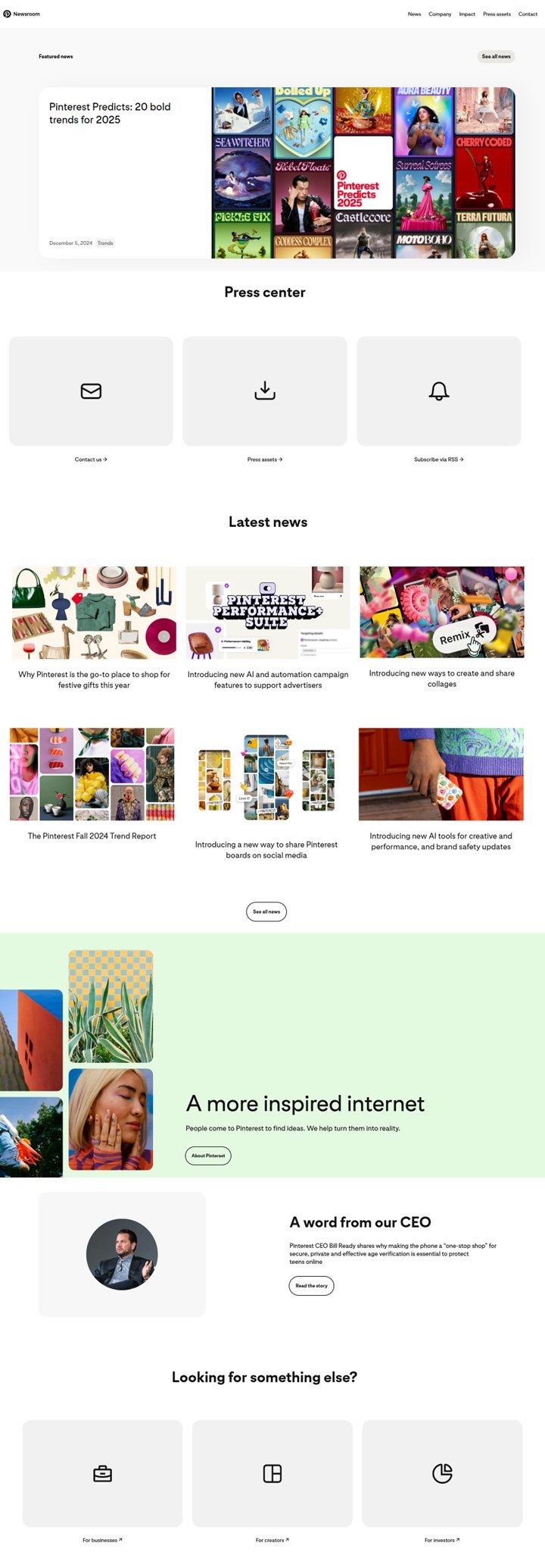 Pinterest's newsroom mirrors their brand identity with a visually engaging, user-friendly layout. Their SEO-optimized content strategy shines through their platform updates, trend reports, and user research. The well-organized multimedia resources section, complete with brand guidelines and high-quality assets, makes it a valuable resource for media covering social media trends.