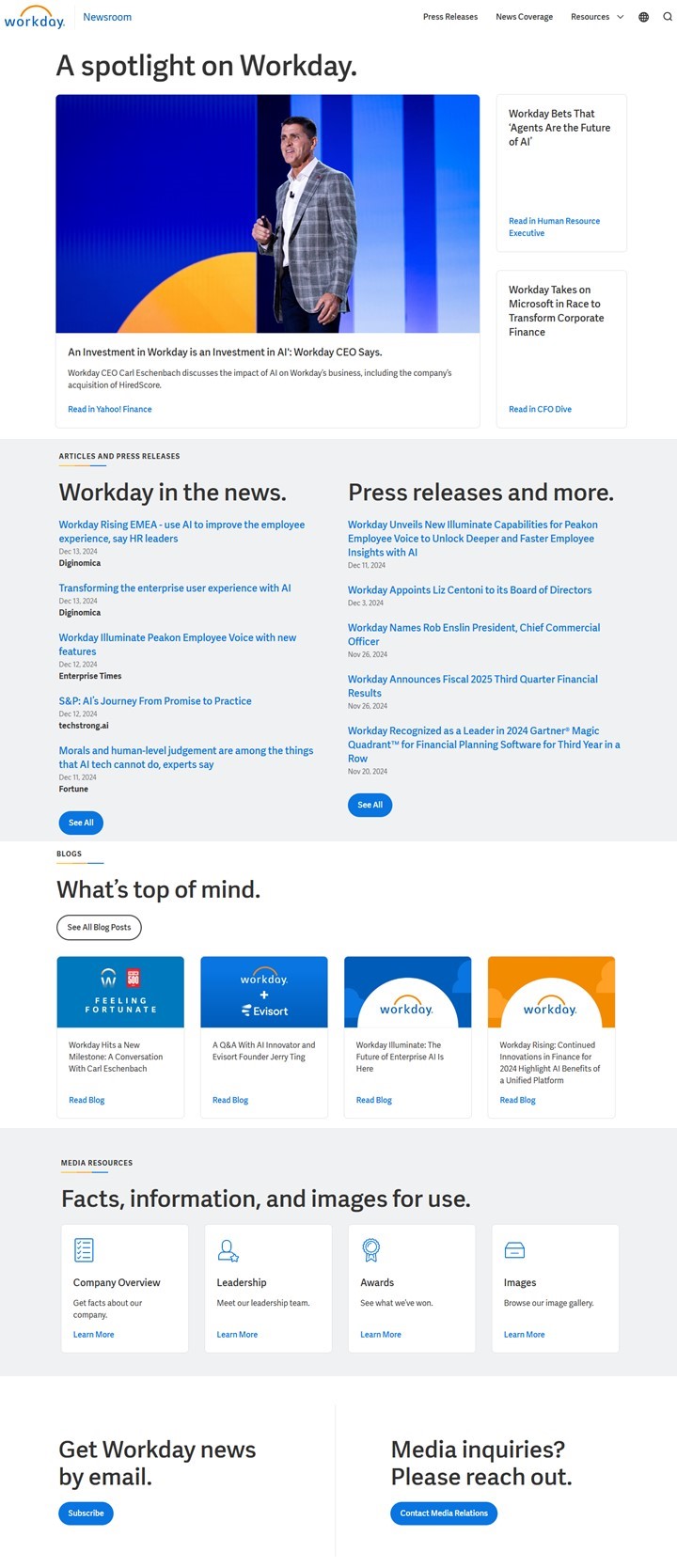 Workday's newsroom masterfully balances technical depth with accessibility. Their streamlined design prioritizes fresh content while maintaining easy navigation to deeper resources. Their comprehensive media center exemplifies best practices with a complete package of company information, leadership profiles, and downloadable assets, all organized to help journalists tell their story.