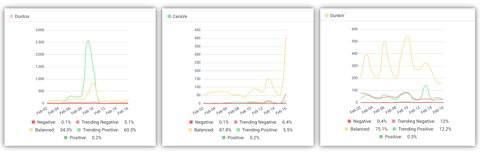 Caption: Sentiment analysis from CisionOne's social listening dashboard show how audience feelings spiked for Doritos, CeraVe, and Dunkin' before during and after last year's Super Bowl.